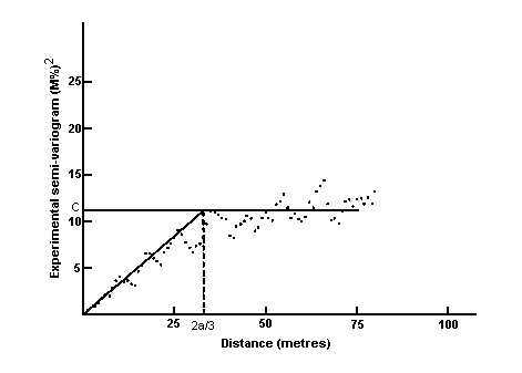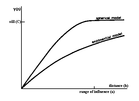 It is a 'model' semi-variogram and is usually called the spherical or Matheron model. The distance at which samples become independent of one another is denoted by a and is called the range of influence of a sample. The value of γ at which the graph levels off is denoted by C and is called the sill of the semi-variogram. The spherical model is given mathematically as: