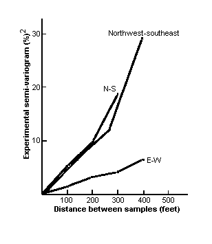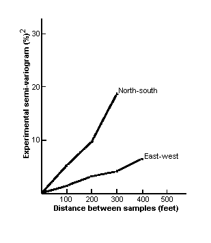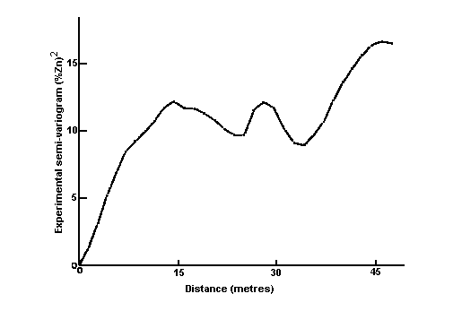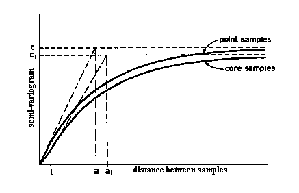 There are some problems with this approach. Which weighting factors are the best to choose? How far do you go in including samples -- if there is a sample 6 which is twice as far away as sample 5, should it be included? How reliable is the estimate when we get it? Can we seriously expect the same estimation method to be equally valid on all types of deposits? On the other hand, the idea of weighting samples by some measure of their similarity to what is being estimated is intuitively appealing. It also seems to avoid those crippling restrictions on what distribution of values you can handle, which so limit the other methods of estimation. 'Similarity' can be measured statistically by the covariance between samples or by their correlation. However, to calculate either of these we have to go back to 'stationarity' type assumptions. Let us look instead at the difference between the samples.