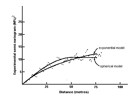 This model rises more slowly from the origin than the spherical and never quite reaches its sill. F igure 1.4 shows the spherical and exponential with the same range and sill. Figure. 1.5 shows the two with the same sill and the same initial slope for comparison. The reason for this will become clear in the next chapter.