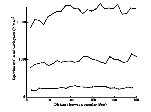 In Fig 1.1 is seems sound to expect that the value at position 5 will be 'very different' from that at A, whilst sample 1, say, will have a value 'not very different' from that at A. Let us make an assumption that the difference in value between two positions in the deposit depends only on the distance between them and their relative orientation. Suppose we took a pair of samples 50ft apart on a north-south line in one part of the deposit, and measured the difference between the two values. Now, suppose we did the same, say, 200ft away. And again in yet another position, and so on. The value obtained (difference in grade) would be different for each pair of samples, but under our assumptions all of these values would be from the same probability distribution. Thus, if we could take enough such pairs, we could build up a histogram of the differences and investigate the distribution from which they were drawn. We would expect that distribution to be governed by the distance between the pair and the relative orientation, i.e. 50ft, north-south. Effectively, we have worked the implicit assumptions of the distance weighting techniques into a statistical form.