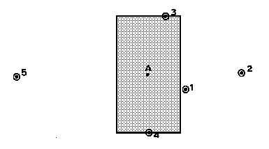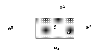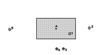 Let us consider the problem of local estimation, e.g. of trying to estimate the value at, say, point A in Fig 1.1, given the samples at the various locations shown. It seems reasonable to evolve an estimation procedure which gives more importance to sample 1 than to sample 5. A whole range of methods have been produced to decide on the 'weight' accorded to each sample, mostly based on the distance of the sample from the point being estimated. Sample values may be weighted by inverse-distance, inverse-distance squared, or by some arbitrary constant (e.g. range of influence) minus the distance. All of these involve the same basic assumption -- that the relationship between the value at point A and any sample value depends on the distance (and possibly direction) between the two positions, and on nothing else. It does not depend on whether one is in a rich or poor zone, or on the actual sample values, but only on the geometric placing of the samples. In fact, it does not even depend on the mineral in the deposit!